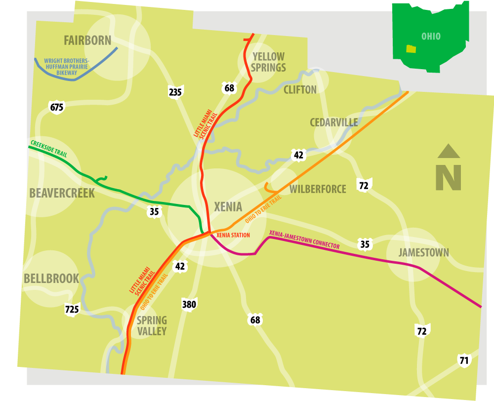 Xenia Station, just south of downtown Xenia is the center of it all. Four out of five of our trails connect so you can get from North to West to South to East – all along the bike trail.
