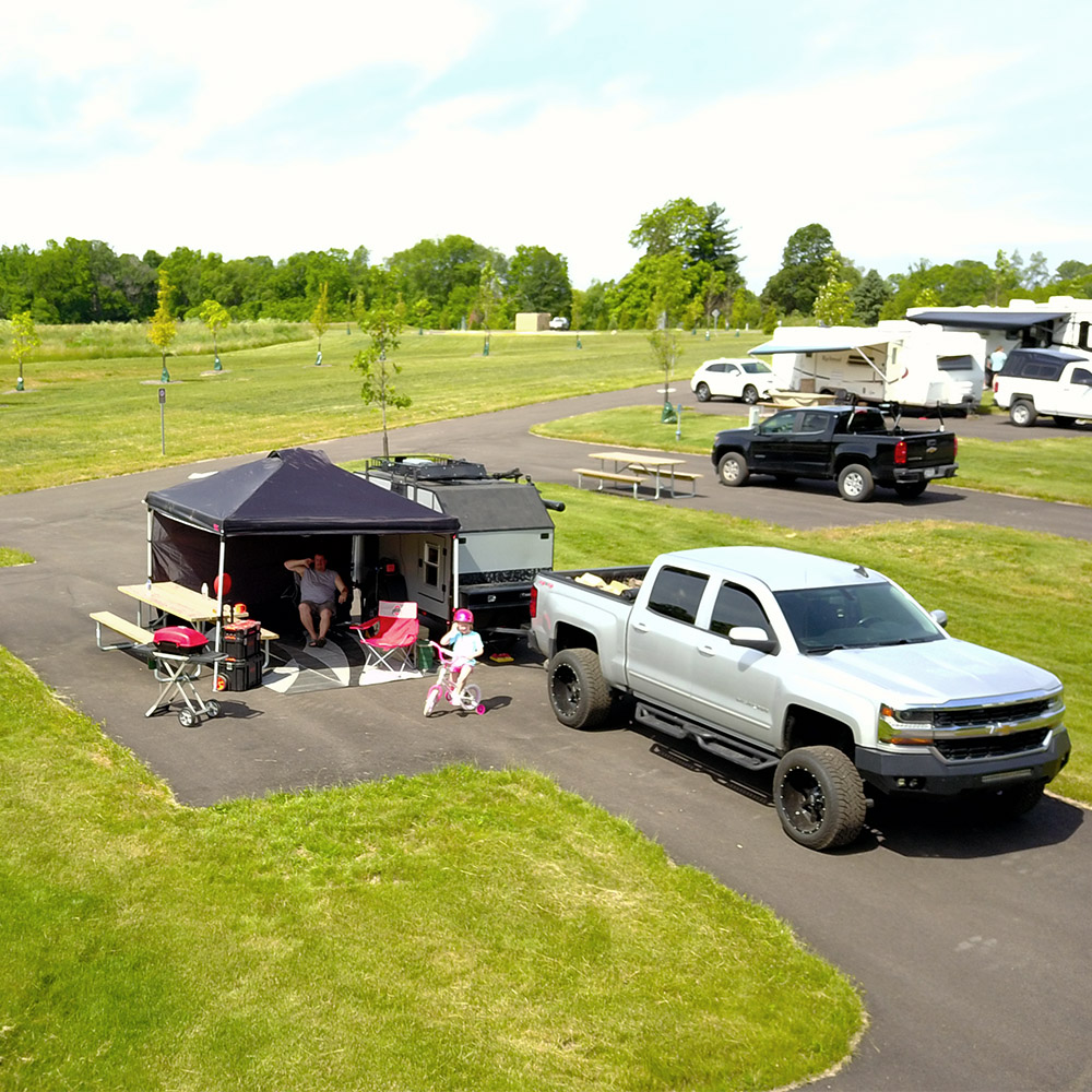 Campers may have one camping unit, one tent and one dining fly, OR two tents and one dining fly. A camping unit is defined as an RV, fifth-wheel, trailer or popup. RVs, fifth-wheels and trailers must remain on the designated pad. Tents are permitted on the grass. Subject to space availability, two vehicles, which includes a tow vehicle, are allowed. Additional vehicles or visitors’ vehicles must be parked in the visitor lot near the main entrance.